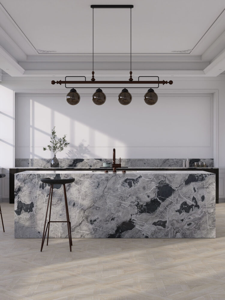 Quarried in Canada, Arctic Ocean quartzite captivates with its swirling diagonal streams of crisp white, soft grey, and deep black that flow naturally across the surface. The intricate layering creates a dynamic sense of movement, while the honed finish brings out the stone’s textured character without glare. This versatile quartzite is ideal for benchtops, feature walls, and flooring, offering a sophisticated balance of rugged durability and refined beauty. Its bold yet harmonious palette adds depth and visual interest to both residential and commercial interiors.