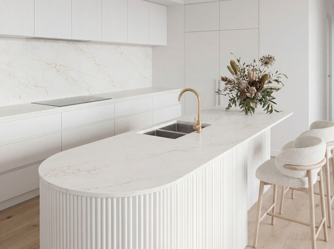 Bernice Gold features a pure white base with soft beige veining. Its gentle patterning brings warmth and a cozy, welcoming feel, making it a versatile choice for homes.
